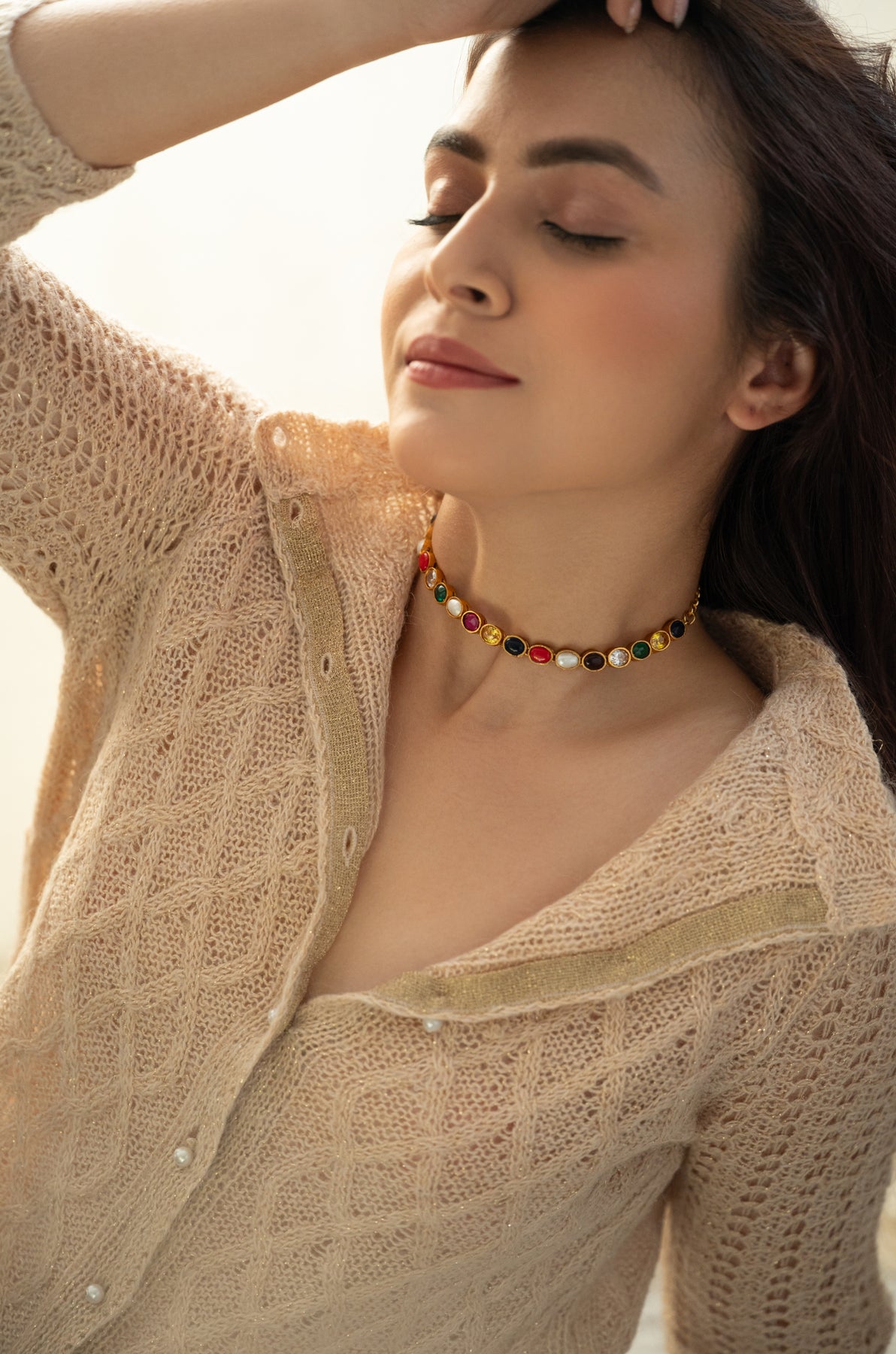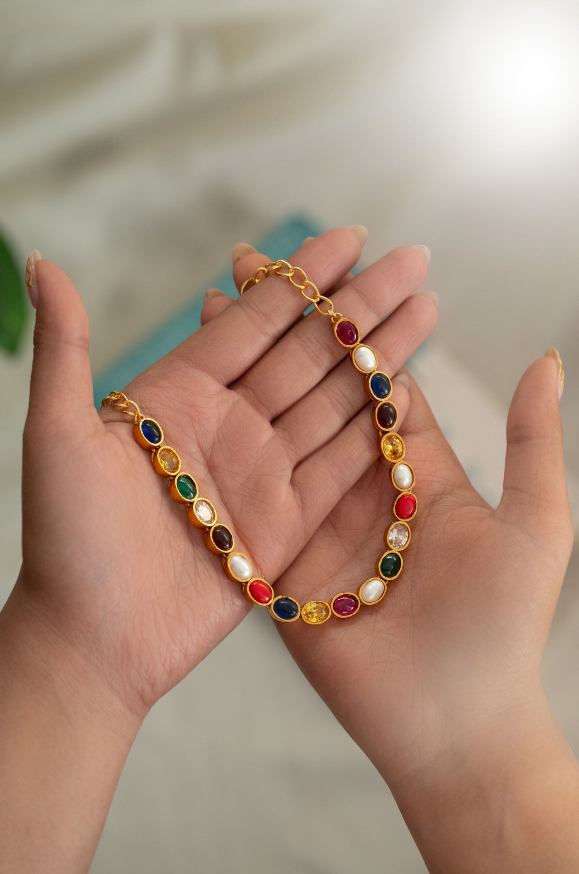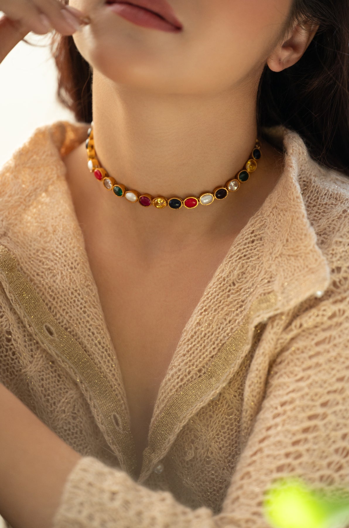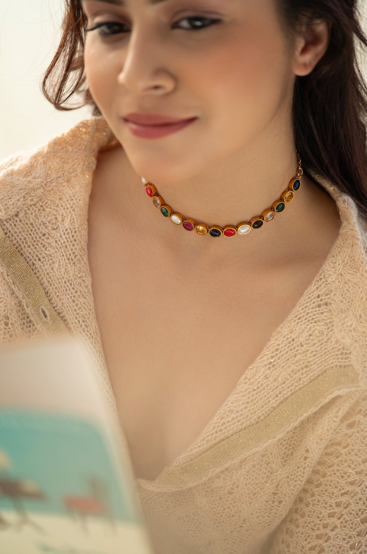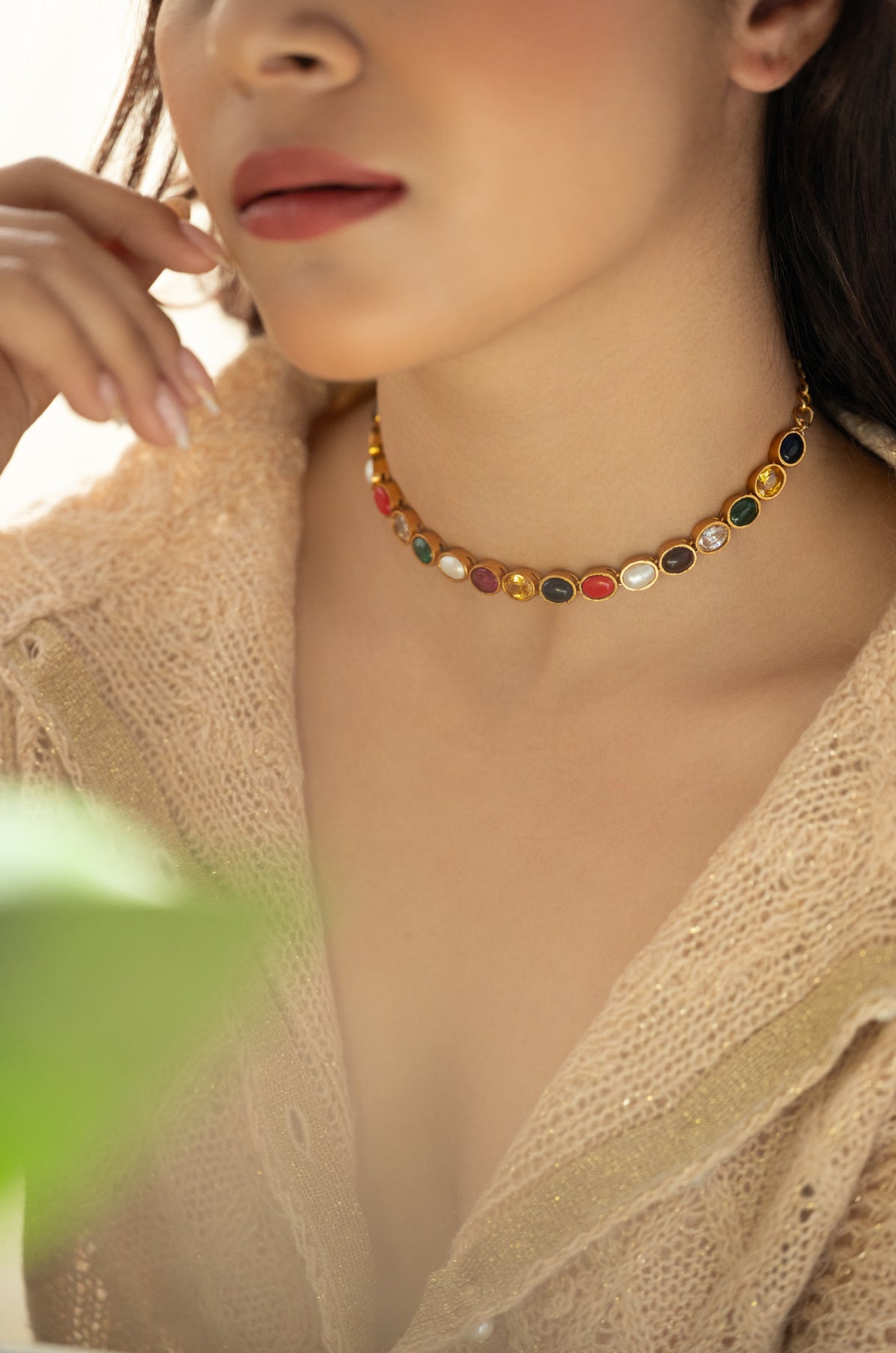 Introducing the Ziva necklace where multicolored stones dance together in perfect harmony. Each vibrant stone tells its own story, creating a mesmerizing display of color and light that catches every eye in the room. Crafted with meticulous attention to detail, this necklace transforms any outfit into something truly magical. Whether you're dressing up for a special occasion or adding sparkle to your everyday style, the Ziva brings that "wow" factor that makes you feel absolutely radiant. A timeless treasure that celebrates the beauty of tradition with a contemporary twist.